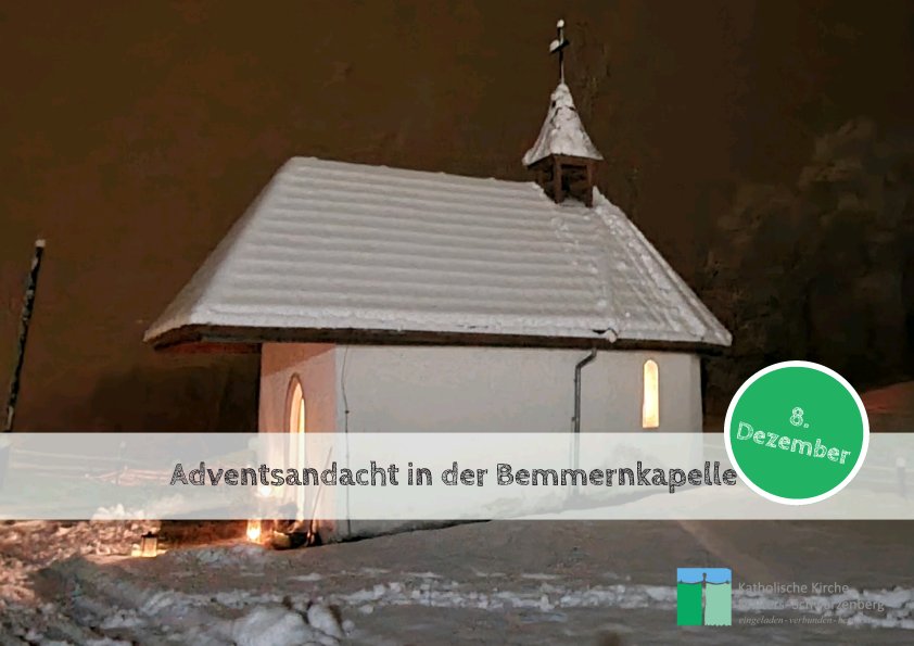 Maria Empfängnis 8. Dezember 19:30, Adventsandacht in der Bemmernkapelle mit Kerzenlicht und Zithermusik, anschliessend gemütliches Beisammensein. PP: bei der Bemmernbrücke, Richtung Stäfali